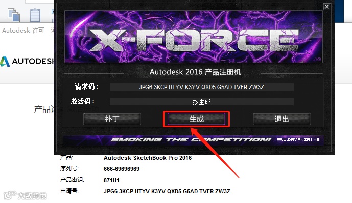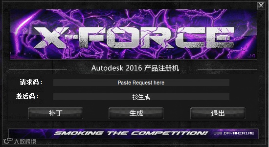 24.使用Ctrl+C键复制申请号,使用Ctrl+V键粘贴到注册机里面的【请求码】中(记得删除原请求码中的内容),点击注册机左下角的【补丁】。