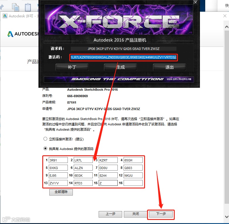 27.全部选中激活码中生成的激活码,使用Ctrl+C键或者鼠标右击复制生成的激活码,粘贴激活码至我具有Autodesk提供的激活码方框中,点击下一步。