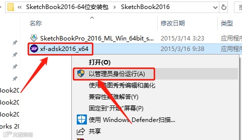 22.打开【SketchBook2016】文件夹,鼠标右击【xf-adsk2016_x64】注册机,选择【以管理员身份运行】。