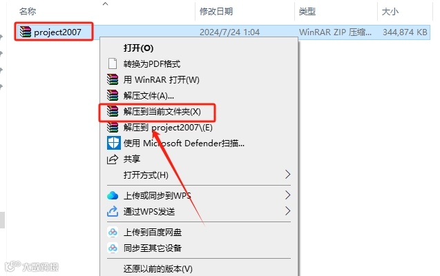 1.打开Project2007软件压缩包,鼠标右击选择【解压到当前文件夹】。