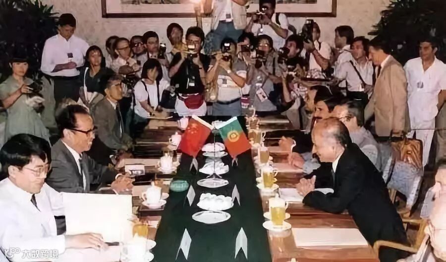 1987年4月13日,中葡两国政府关于澳门问题的“中葡联合声明”在北京人民大会堂正式签署,确定中国政府于1999年12月20日恢复对澳门行使主权。这是邓小平与时任葡萄牙总理席尔瓦举杯祝贺。