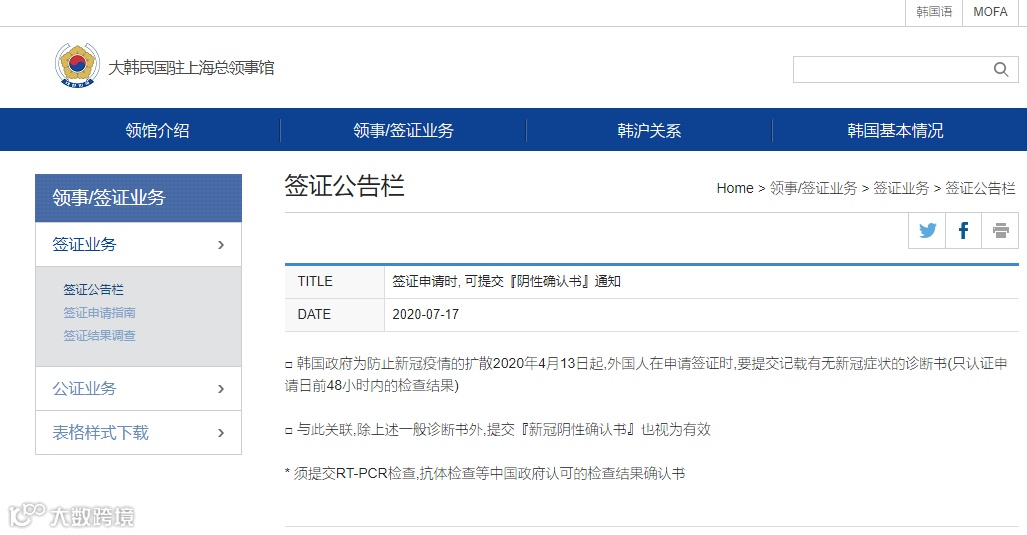 韩国政府为防止新冠疫情的扩散2020年4月13日起,外国人在申请签证时,要提交记载有无新冠症状的诊断书(只认证申请日前48小时内的检查结果)