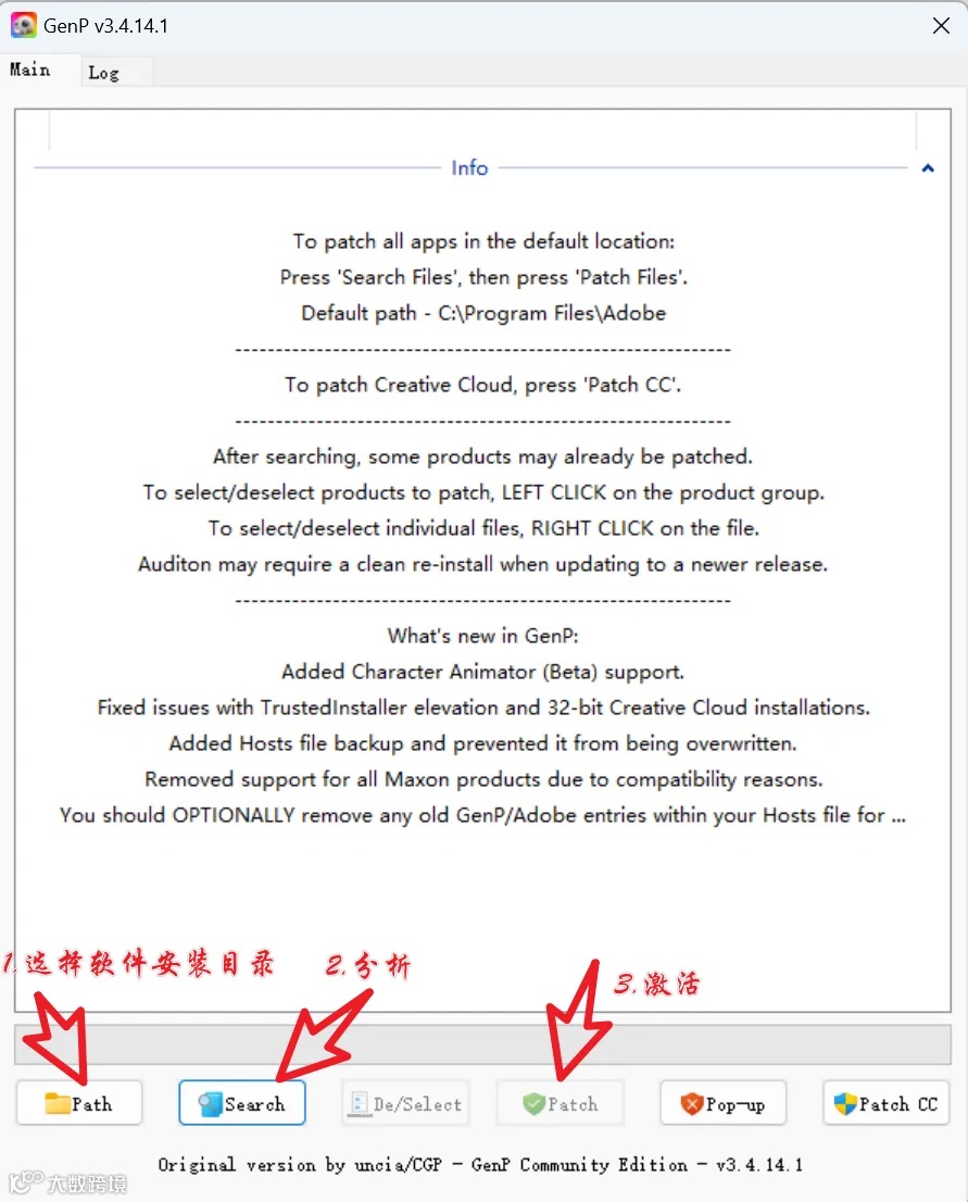 6.首先点“Path”选择软件安装目录,再点“Search”进行分析,最后点“Patch”