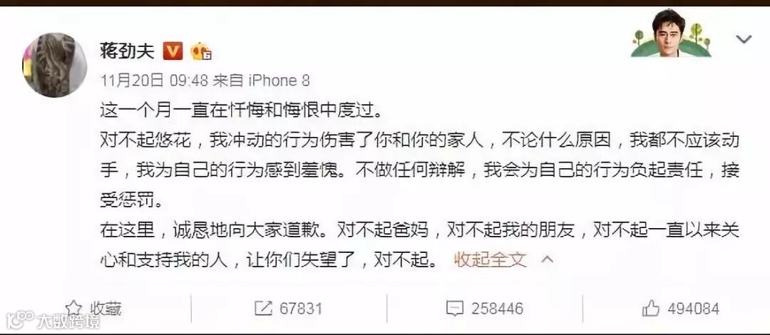11月20日,蒋劲夫前女友中浦悠花更新ins,晒出多张身体淤青照片,疑似曝光蒋劲夫家暴。随后,蒋劲夫在微博承认家暴,一时间引起热议。
