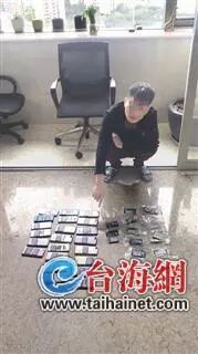 桌上放着多台手机和大量银行卡