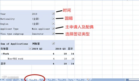 其实下载好的这份官方统计表格解读起来非常简单易懂,只要选中你想查询的年份、国家、签证类型,想要的结果都会一目了然。打开表格“entry-clearance-visa-outcomes-datasets-sep-2019”,以Vis D01为例,如果想查询2019年第二季度和第三季度的全球创新者签证过签情况,那么操作如图所示: