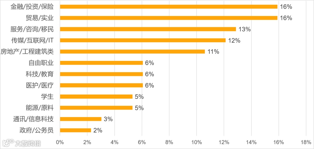从事行业比较广泛,金融、投资、房地产行业从业者仍然居多,从事贸易、互联网、医疗行业的投资人有所增加。