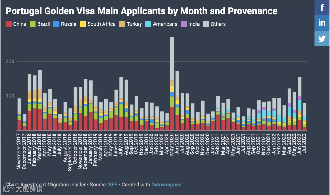 葡萄牙黄金签证申请人来源地主申请人数量(月度)