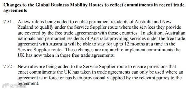 为了履行英国与澳大利亚和新西兰签订的自由贸易协定中所做出的承诺。本次修正案中对于澳大利亚公民和澳大利亚永久居民将能够在服务供应商签证路径(Service Supplier route)上一次停留长达12个月。