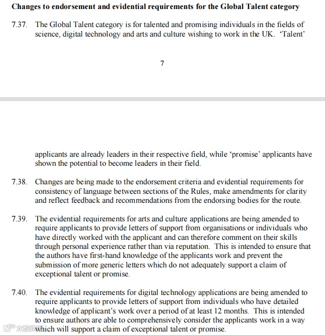 全球精英签证类别是面向希望在英国工作的科学、数字技术、艺术和文化领域的有才华和有前途的个人。 申请人需要在各自领域的已经成为领导者或潜在领导者。本次修正案修改如下: