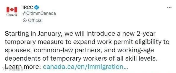 自2023年1月起,加拿大将通过一项为期两年的临时措施,所有外国劳工的配偶和适龄工作的子女,都可以申请开放式工签(Open Work Permit),且不再限制工种。