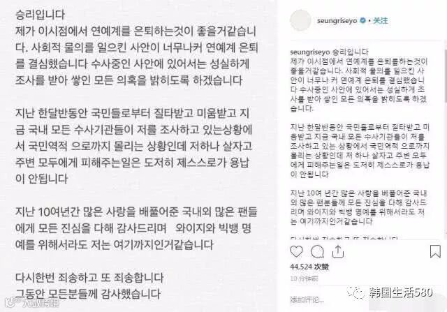 近日经历夜店风波、性招待等一系列负面新闻缠身的Bigbang成员胜利在个人社交平台发文宣布退出娱乐圈。然后他个人也是发表声明:“对于正在调查中的案件,会诚实的接受调查。