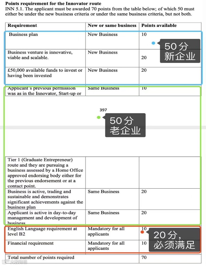如上图,按照这张打分表,新企业(蓝框+红框)或同一企业(绿框+红框)完全是参照现有条件转换成了打分形式,申请条件和难度并没有本质的变化。对于创新签证的申请人来说,要求仍然是非常宽松的。