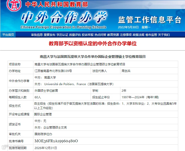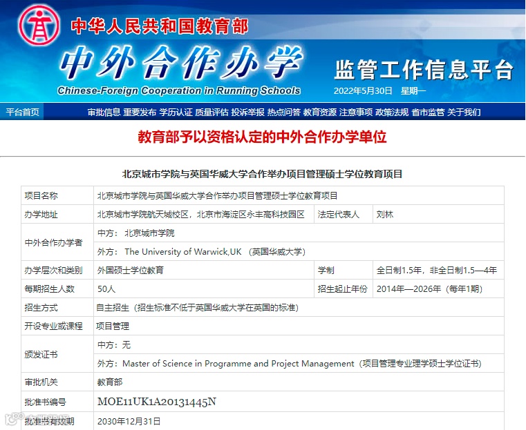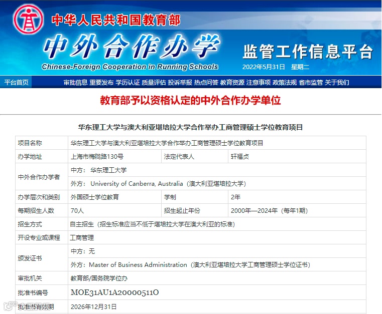 中国教育部批准书编号:MOE31AU1A20000511O 查询地址: https://www.crs.jsj.edu.cn/aproval/detail/493 专业:工商管理硕士 学制(非全日制):2年 授课方式:线下+线上 授课安排:中教授课安排在每周周六;外教集中授课安排在周六、周日及部分工作日晚上。 授课语言:英文为主 毕业要求:该项目属于英联邦教育体系下的课程硕士,采用修学分制,修完所有的课程且每门课程考试皆合格即可毕业,不做毕业论文要求。 项目学位 堪培拉大学工商管理硕士 (MBA) 学位证书,并可在中国教育部留学服务中心申请办理学历、学位双认证。还可获得华东理工大学结业证书。