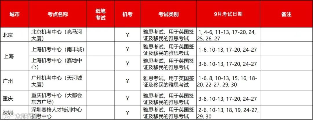 9月在原有4个纸笔考试日期(9月5日,12日,17日和26日)基础上,新增9月3日,20日和27日3个纸笔考试日期。同时,在北京、上海、广州、深圳和重庆的雅思机考中心在全月的多个考试日期提供场次众多的雅思考试和用于英国签证及移民的雅思考试机考服务。