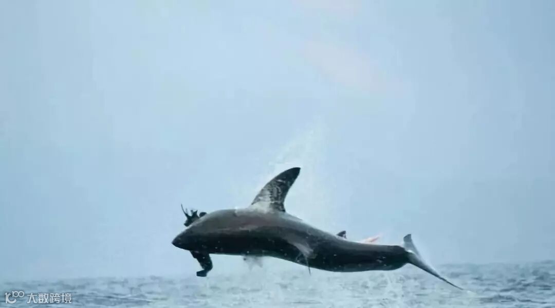 资料图:2017年4月12日消息,南非开普敦,一条大白鲨被船只投放的海豹诱饵吸引,跃出水面高达1.5米进行捕食。图片来源:视觉中国