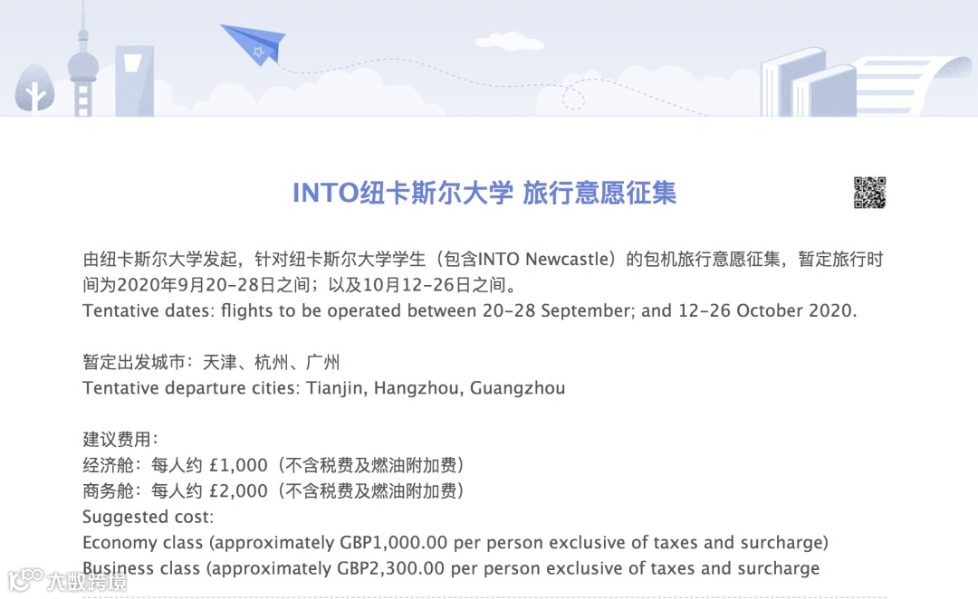针对以上同学,纽卡斯尔大学提供的可选包机出发地为天津、杭州和广州。
