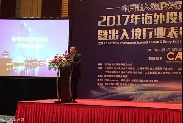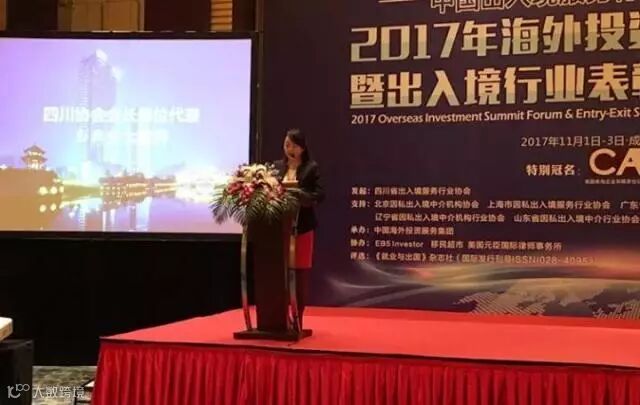11月2日,2017海外投资高峰论坛暨出入境行业表彰盛典在成都盛大召开。这是一次因私出入境行业的盛会,全国100多家移民公司、300多位行业机构负责人共聚一堂,共同探寻“一带一路”宏观战略下的投资方式,为接下来的发展出谋划策,同时对二十年来因私出入境行业内涌现出来的、为行业发展做出贡献的机构和个人进行表彰。四川省狄邦出国事务服务有限公司应邀参加了本次活动,并荣获“出入境行业最具代表企业”的殊荣。