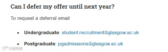 格拉斯哥大学大部分专业允许defer,直接向招生办发送申请延期邮件即可。
