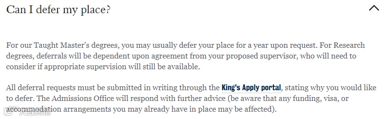 伦敦国王学院的部分专业在交了押金和满足学术条件的情况下可以延期一年,在King‘s Apply portal 联系学校即可。