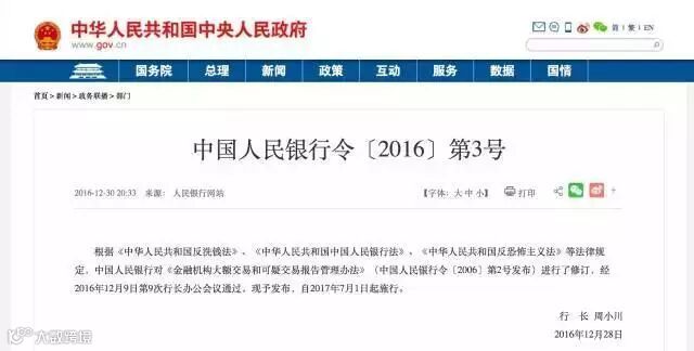 2016年底,最后一个工作日,中国人民银行令〔2016〕第3号,央行公布《金融机构大额交易和可疑交易报告管理办法》,从2017年7月1日起,正式实施。