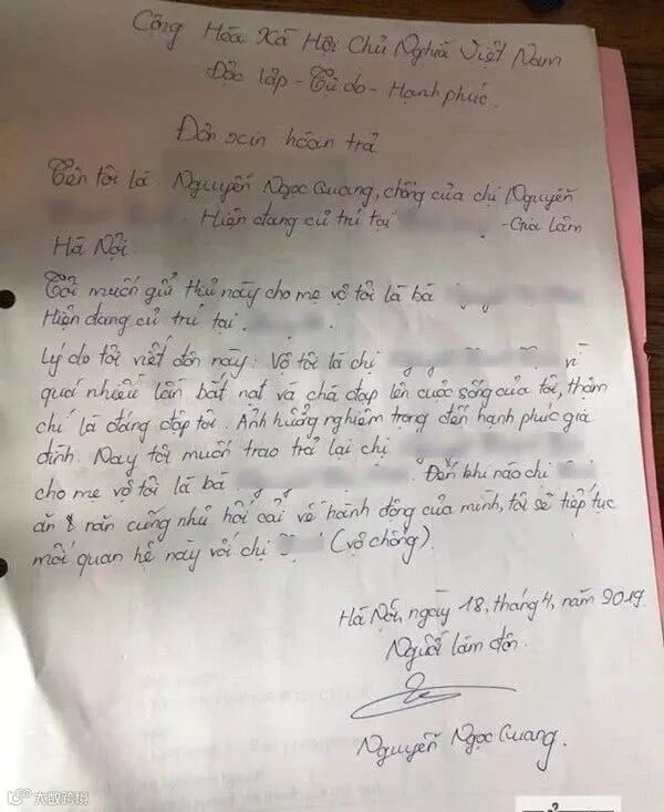 越南一名男子向岳父母诉苦称,老婆管得太严,自己已经无法承受,要求“退货”。男子希望岳父母可以把妻子领回去教育。