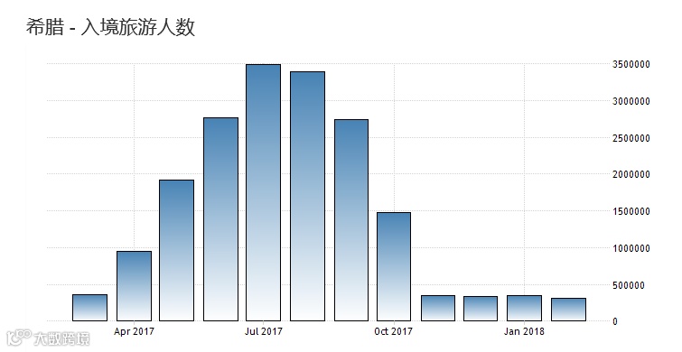 希腊旅客平均数从2007年至2018年为10,895,26.52人,2017年7月达到3,491,724人的历史新高。2018年2月,希腊的外国游客人数同比上涨24.9%至307.05万人。