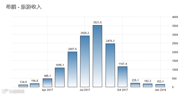 从1997年到2018年,希腊的旅游收入平均为890.94欧元,在2017年8月达到3521.50欧元的历史最高点。作为一个旅游国家希腊的旅游业一直非常的兴旺,并被TripAdvisor评为欧洲最佳旅游目的地之一。
