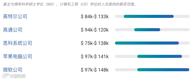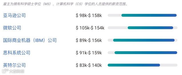 CS热门就职公司包括亚马逊、微软、IBM、英特尔以及思科等,大致就业情况如下:
