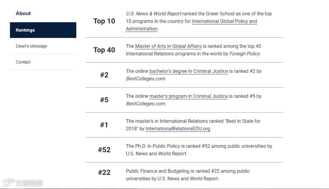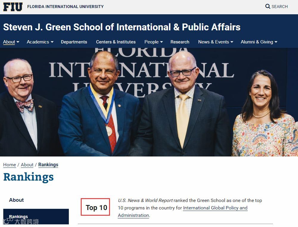 FIU 国际关系学院排名全美第64名,是国际事务专业协会(APSIA)的附属成员,致力于创造一个更加公正、和平和繁荣的世界。专业排名方面,全球政策与管理专业全美排名前10,与哈佛、耶鲁、哥大等高校分庭抗礼!