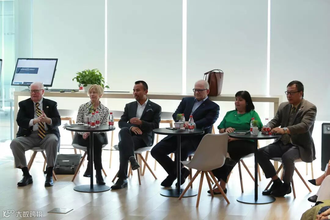 FIU领导一行:校长马克·罗森伯格(右三)、校长办公室副主任达尼亚·皮尔森(右二)、副教务长卢鹏(右一),国际关系学院院长约翰·斯泰克(左一),酒店管理学院院长迈克尔·成(左三),现代外语系主任帕斯卡尔·贝赛(左二)