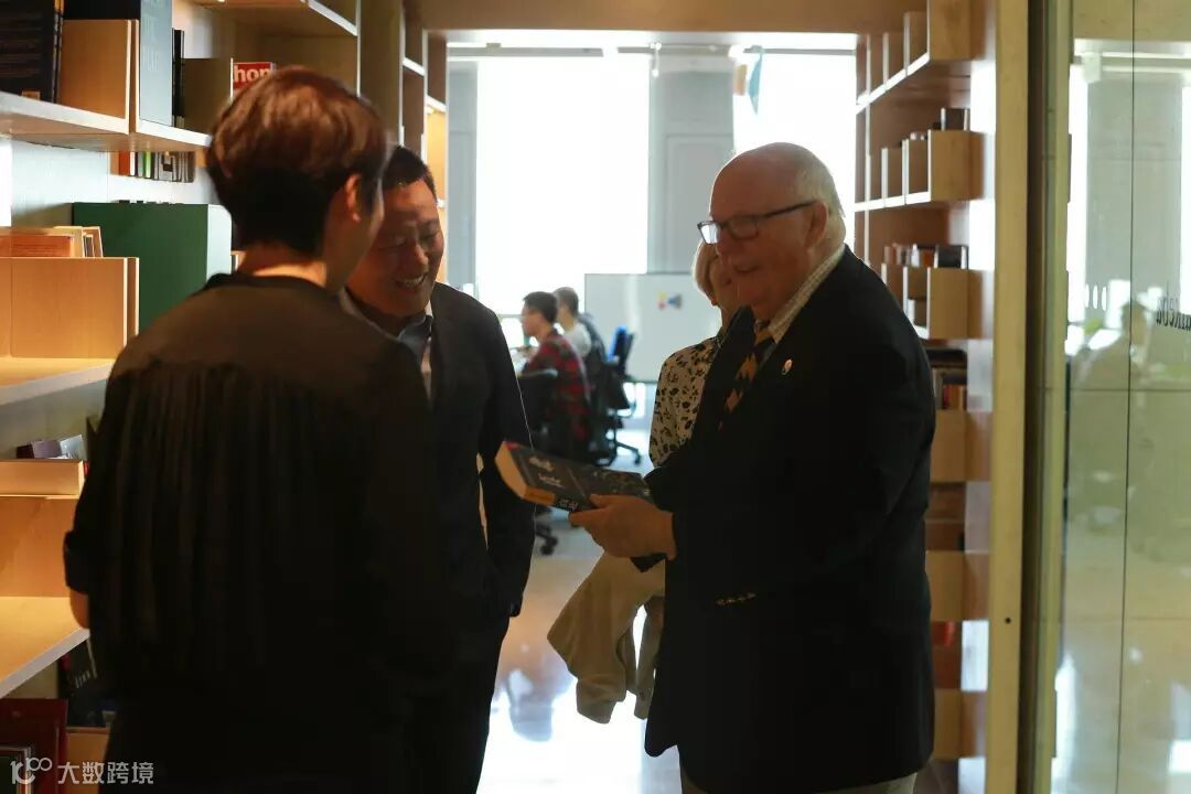 慧科集团CEO岳喜伟为国际关系学院院长约翰·斯泰克、现代外语系主任帕斯卡尔·贝赛介绍真北图书馆,并赠送中文版图书《真北》(真北图书馆之名即源于此书)