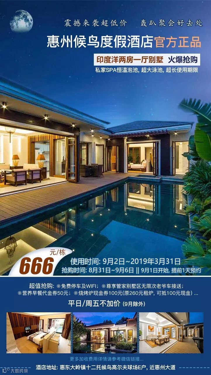 2、2018年10月至2019年3月周日至周五不加价,周六加500元/栋,节假日除外;
