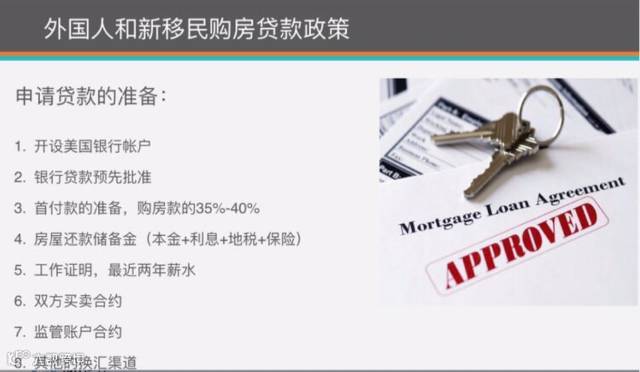 目前,美国有不少银行和贷款机构向无信用记录或收入证明的外国购房者和新移民提供按揭贷款。如果购房者的首付款达到房价的35%-40%,一般就可获得贷款。通常,贷款银行还会要求购房者提供一年的房屋还款储备金,即一年所需支付的本金+利息+地税+保险。