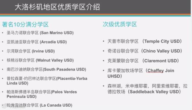 接下来为大家简单介绍一下大洛杉矶的一些顶级和优质学区。从地图上看,洛杉矶的优质学区在各个方位均有分布,新移民可以根据自己家庭的需要选择合适的地区。升学率是一个比较客观的评判标准,从加州大学伯克利分校和加州大学洛杉矶分校的统计数据来看,洛杉矶这些满分学区的录取率都在20%左右,是相当不错的成绩。