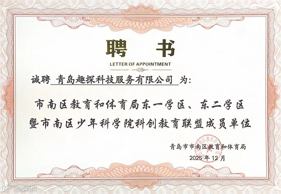 2025年12月16日,市南区东一东二学区科创教育联盟启动会圆满举办,本次会议以“科创赋能提质效 联盟聚力启新程”为主题,通过现场观摩、工作汇报、联盟启动、专家指导等环节,凝聚多方合力,擘画区域科创教育协同发展新蓝图。在本次大会上,集团子公司青岛趣探科技服务有限公司正式成为市南区教育和体育局东一学区、东二学区暨市南区少年科学院科创教育联盟成员单位,成为区域科创教育生态的重要共建力量。