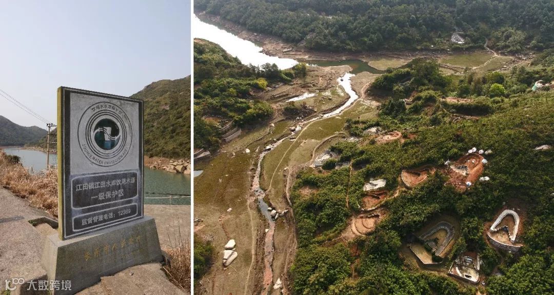 左图:福州市长乐区南阳山上一处水库旁的“江田镇江田水库饮用水源一级保护区”石碑;