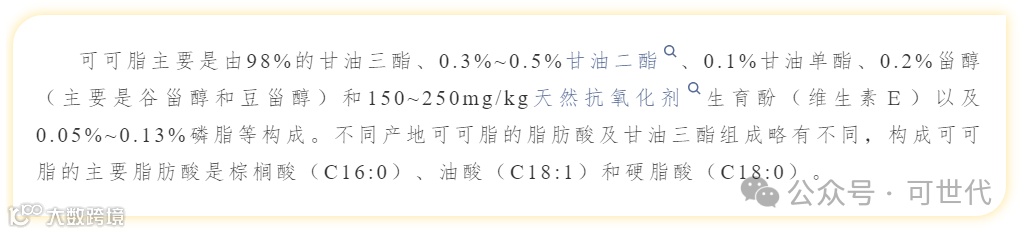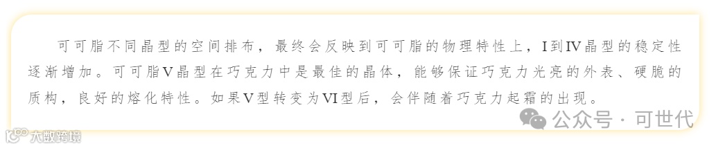 可可脂是一种自可可豆提取的植物硬脂,液态呈琥珀色,固态呈淡黄或乳黄色。可可脂的产地、品种、加工方式均会影响巧克力的产品品质,尤其是可可脂的组成及结晶特性对于能否获得高品质的巧克力产品至关重要。