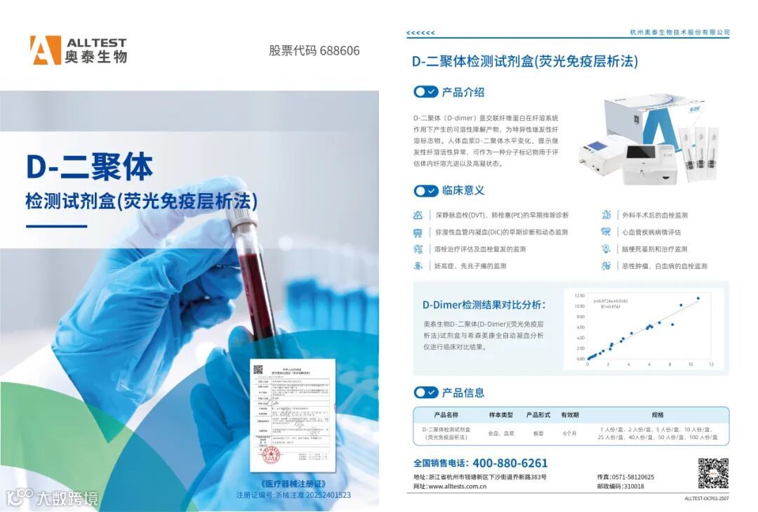 当人体的血液系统某处发生血管损伤,则凝血系统开始工作,用纤维蛋白快速封堵伤口。纤维蛋白经过活化和水解,产生特异的降解产物称为“纤维蛋白降解产物”。D-二聚体是最简单的纤维蛋白降解产物,对血栓形成具有很高的敏感性。