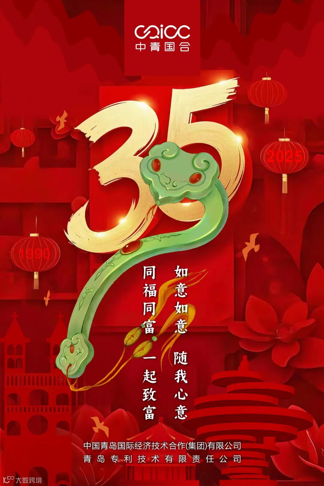 值此新春佳节之际,中国青岛国际经济技术合作(集团)有限公司心怀感恩,向各界伙伴致以最诚挚的问候和最美好的祝愿。愿大家在新的一年,事业蒸蒸日上,家庭幸福美满!