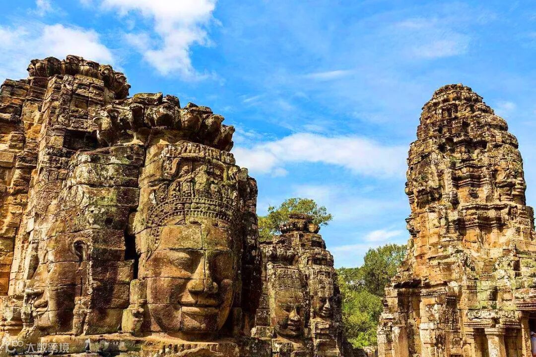 大吴哥城共有五座城门,城门高20公尺,城门上雕有四面佛像,四面都刻着吴哥王朝全盛时期国王加亚巴尔曼七世的面容。