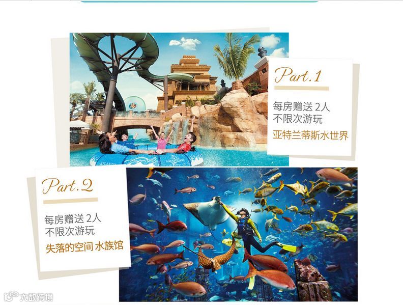 6、入住期间无限次免费畅游“亚特兰蒂斯水世界”和“失落的空间水族馆”(属于赠送项目,所自动放弃,费用不退,视运营情况而定 ,仅限前台入住登记客人,每房最多2位客人)