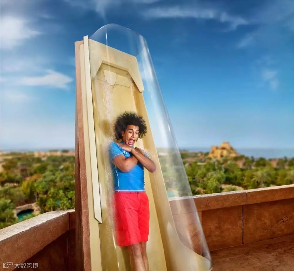 滑道高24米,坡度70-75度,最高速度可以达到73公里/小时!也被叫做3秒滑道… 滑道底端既是生活着数十只鲨鱼的鲨鱼池。