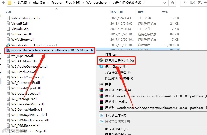 13.返回到解压的【万兴全能格式转换器】文件夹中,然后鼠标右击【wondershare.······】注册机,选择【以管理员身份运行】。