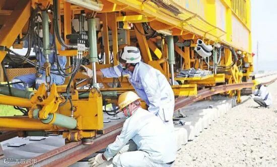 据负责铺轨的中国电建市政集团项目部负责人介绍,这些中国产钢轨采用全套中国产装备和先进脉动闪光焊工艺,将50米钢轨焊接成500米长钢轨后,用长轨运输列车运输至施工现场进场轨道铺设。此次有砟轨道铺轨使用CPG500有砟铺轨机,采用“单枕连续法”进行铺设。轨道铺设后经上砟整道、无缝线路施工、轨道精调整理和钢轨预打磨等达到验收标准。
