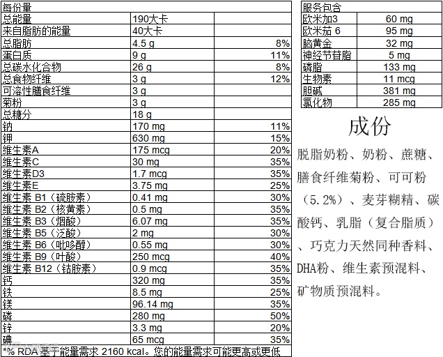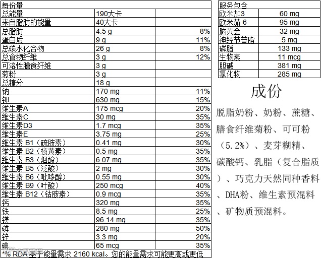 奶粉、糖、乳清粉、麦芽糊精、巧克力粉、碳酸钙、矿物质预混料、维生素预混料、牛奶天然相同香料、巧克力天然相同香料、麦芽天然相同香料。