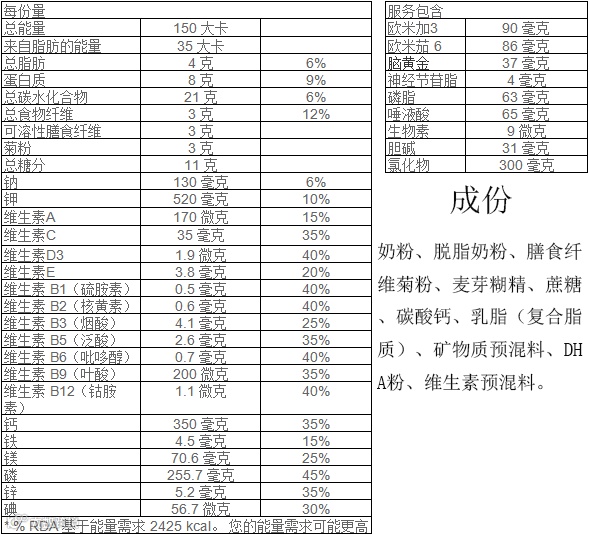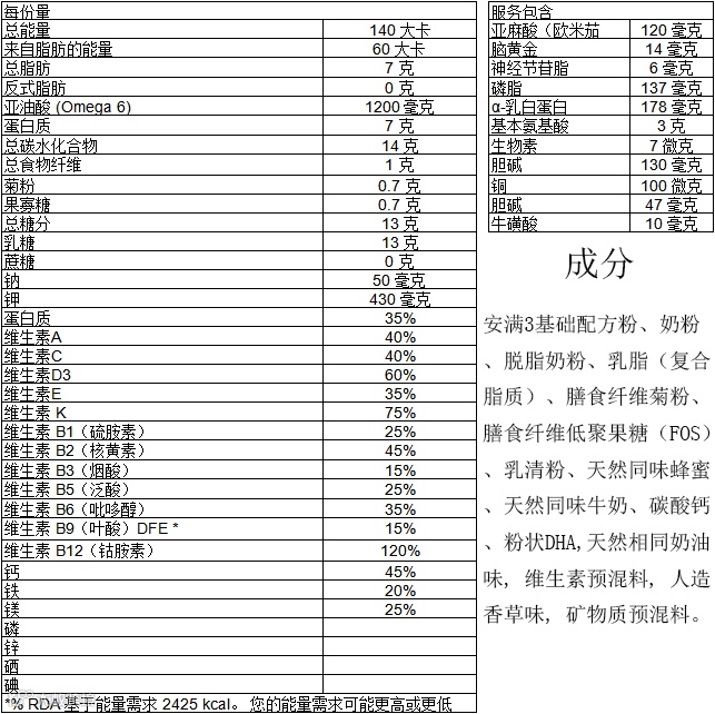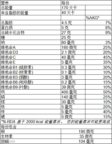 水、脱脂奶粉、奶粉、糖、蔬菜稳定剂、天然相同口味的香草、碳酸钙、维生素预混料。