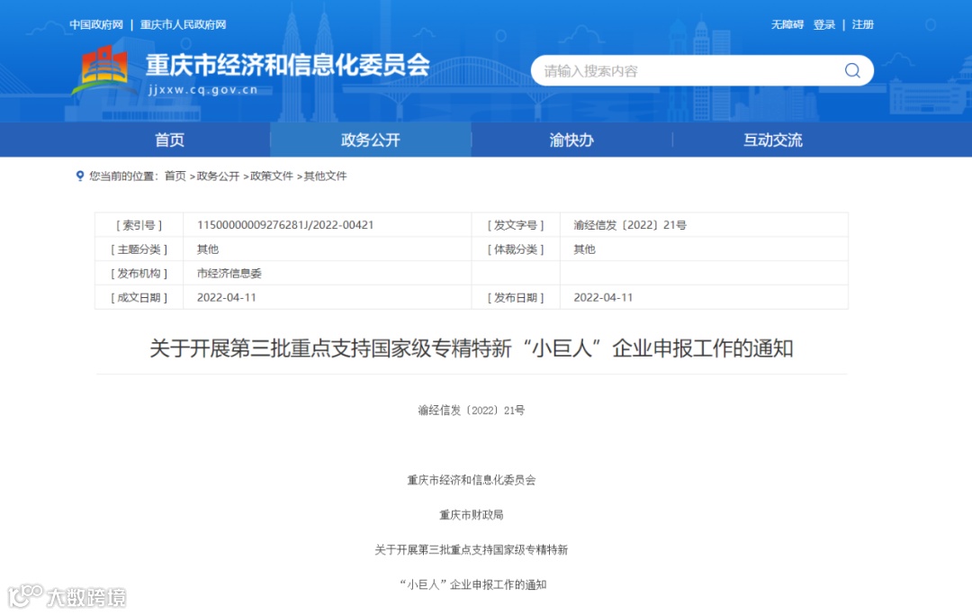 看过来!专精特新“小巨人”企业申报工作开始啦。2022年4月11日,重庆市经信委发文关于开展第三批重点支持国家级专精特新“小巨人”企业申报工作的通知。