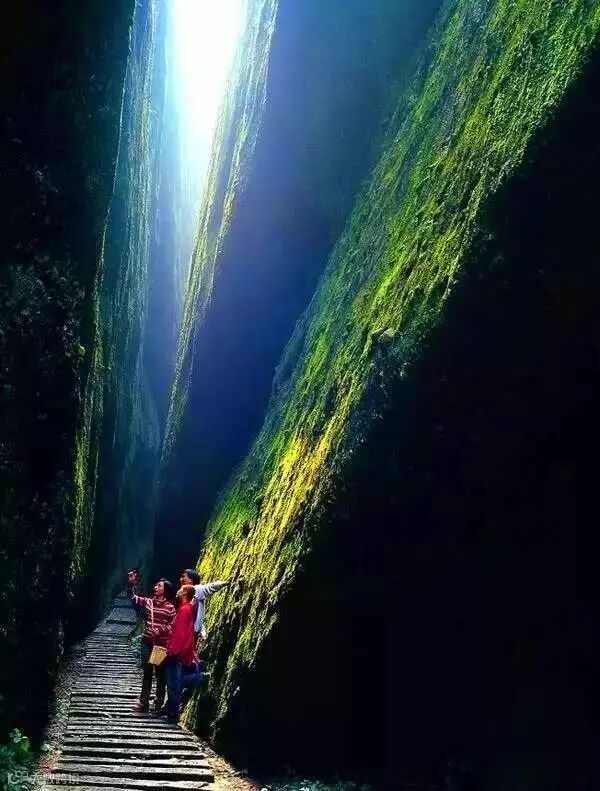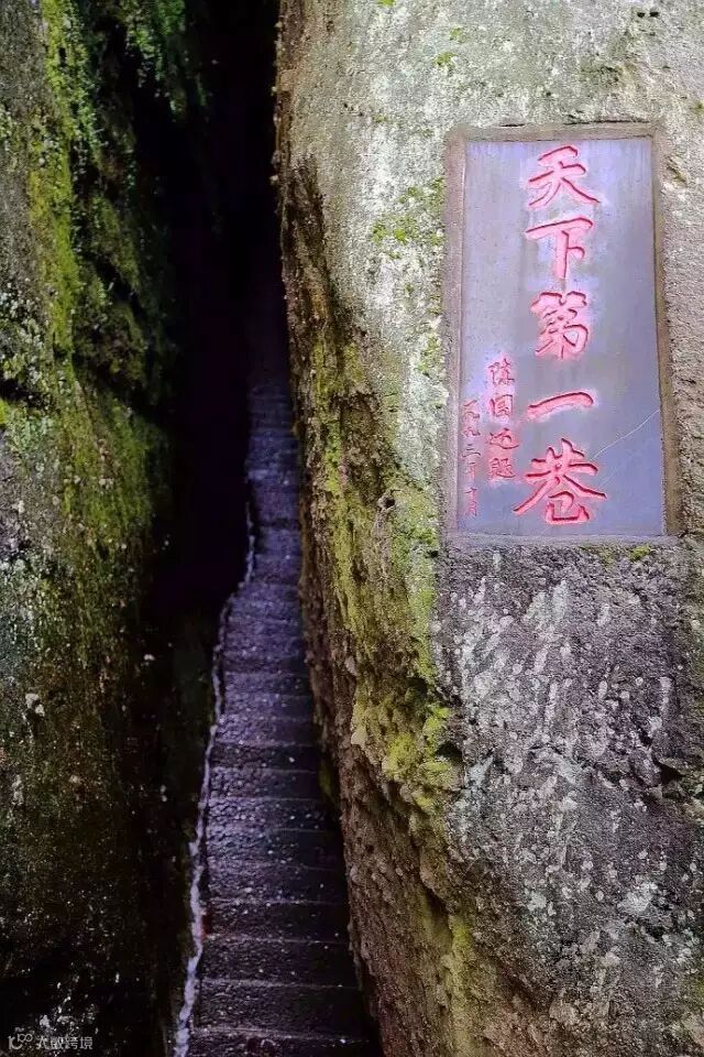 天一巷 全长238.8米,两侧石壁高80—120余米,最宽处0.8米,最窄处0.33米。这大概就是传说中的一线天。两旁绝壁对峙,笔直如刀壁斧削,抬头唯见一线青天,可谓世界一线天绝景。