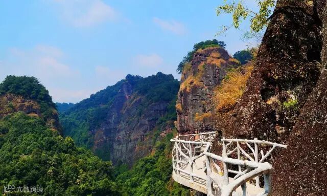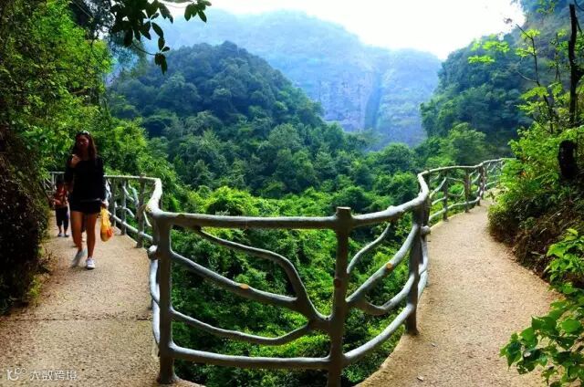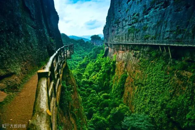 登上栈道,在悬崖峭壁间领略奇山奇石的奇秀风光,穿过了湿润阴凉的峭壁山林,眼前豁然开阔,半米多宽的栈道弯弯曲曲地悬挂在陡峭的石壁间,头顶是峭壁,脚下是悬崖,让不少游客直呼头晕。